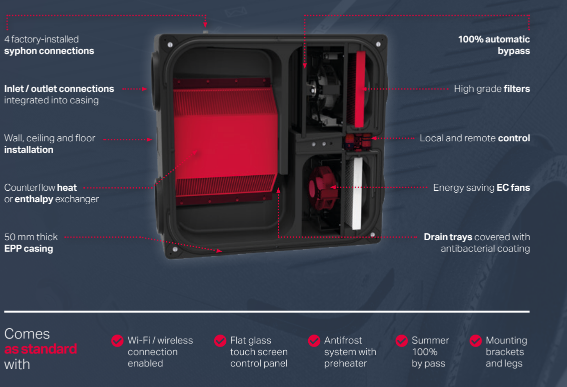 ARIA VITALE este singura unitate de recuperare a căldurii de pe piață astăzi, cu șase configurații de instalare. Acest lucru oferă fiecărui utilizator libertatea de a alege locația și poziția corectă de instalare. Datorită greutății reduse a unității și diferitelor configurații de montare, instalarea și întreținerea sunt extrem de simple.